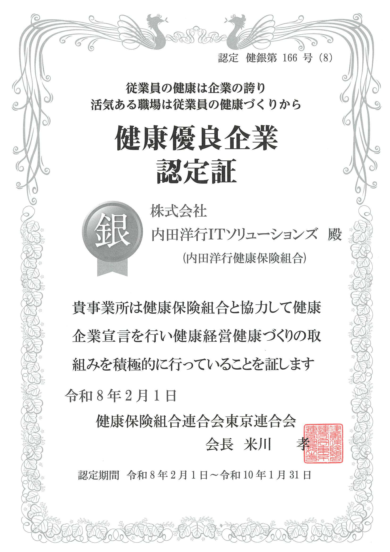 健康保険組合連合会東京連合会が実施する健康優良企業認定制度において、一定の成果を収めた企業に与えられる認定です。認定は、健康企業宣言東京推進協議会が定めた「評価基準と確認方法」にもとづく審査で、80点以上の評価を得た企業に認定証が発行されます。