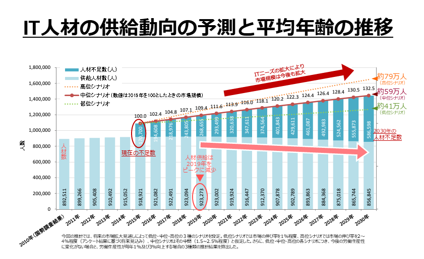 さらに、IT人材の多くが30代前半であることから、少子高齢化の影響を受けて今後も人材不足が加速することが予測されています。