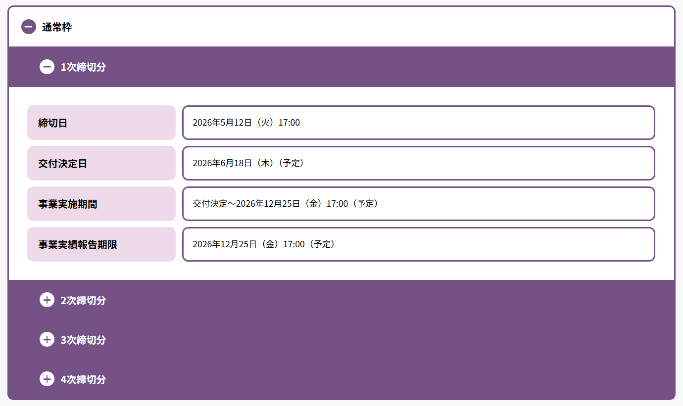 2026年度の公募は、例年通り春頃から開始され、既に3次、4次までスケジュールが確定しています。